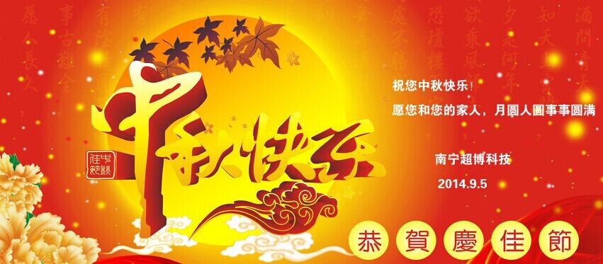 您好!又是一年中秋佳节至,“中秋节”期间我司按国家规定安排放假,9月6日-9月8日放假,9月9日(星期二)上班,超博科技全体员工祝福广大客户人月两圆,合家欢乐,心想事成!