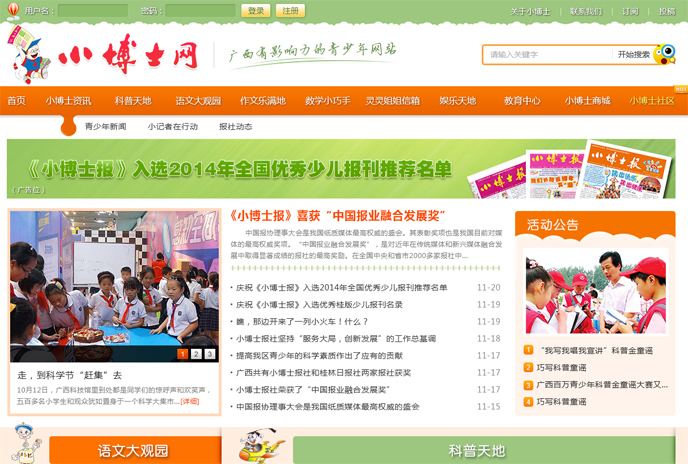 【小博士报简介】《小博士报》创办于1984年,是广西科协主办的一张面向全国中小学生的综合类报纸。创办25年来,本报始终坚持以质量求生存,以品牌赢市场,坚持正确 的舆论导向,遵守新闻出版管理法规,以向广大青少年提供丰富的、优质的精神食粮为己任,树立了报社的良好形象。本报也因此获得了一系列荣誉:2006年, 在国家新闻出版总署组织的全国教育类报纸质量检查中,获得总分的好成绩;2007年,在同类评比中又获全国第三名;2008年,被评为“广西十佳报 纸”、国家新闻出版总署推荐优秀少儿报刊。2009年3月,在2008年度全国教育类报纸质量综合分数评定中,荣获了“全国教育类报纸质量检查免检报纸”资格。