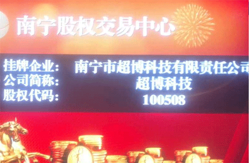 2016年1月29日,广西超博在南股交所挂牌,股权交易代码 100508。此次超博登陆南宁股权交易中心挂牌,对于促进企业规范管理、扩大企业知名度、提升企业股权的价值及流动性、获取间接及直接融资以及政府政策扶持,进一步拓宽融资渠道,逐步迈向各层次资本市场,将起到积极的促进作用。